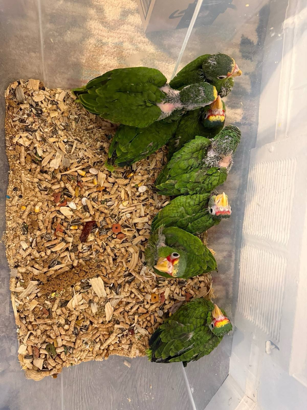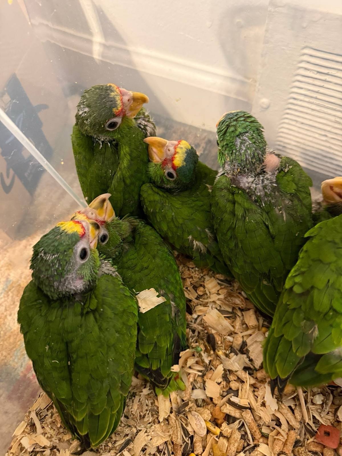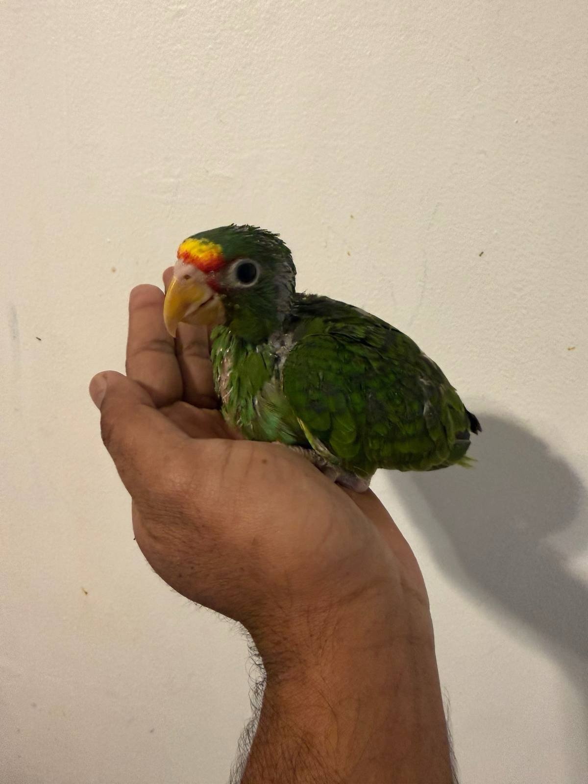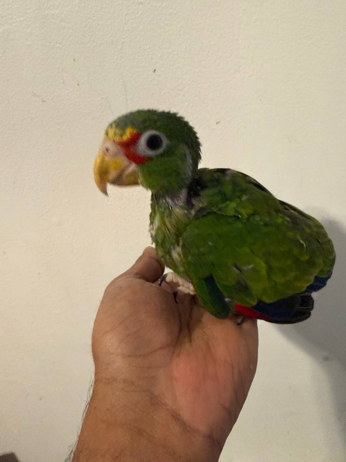 This 4-week-old baby White-Front Amazon parrot is hand-fed and raised in a controlled, healthy environment. At this early stage, the bird is already showing strong development and will grow into a highly intelligent and social companion.
